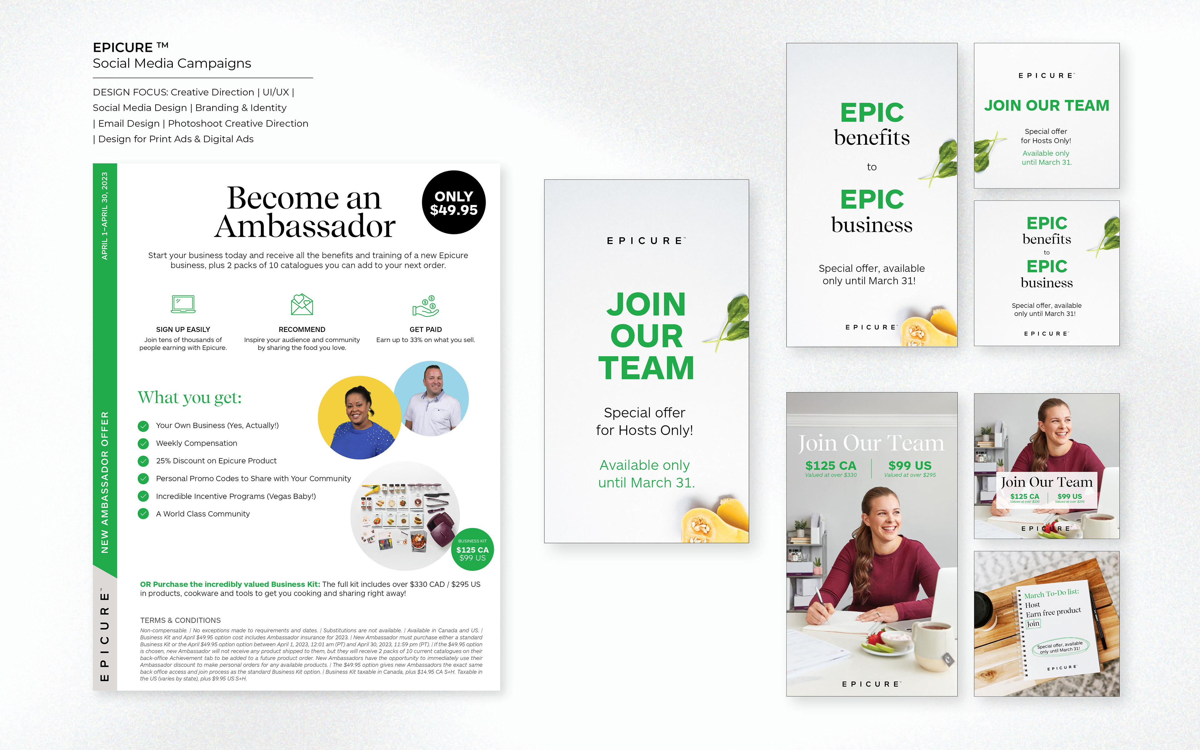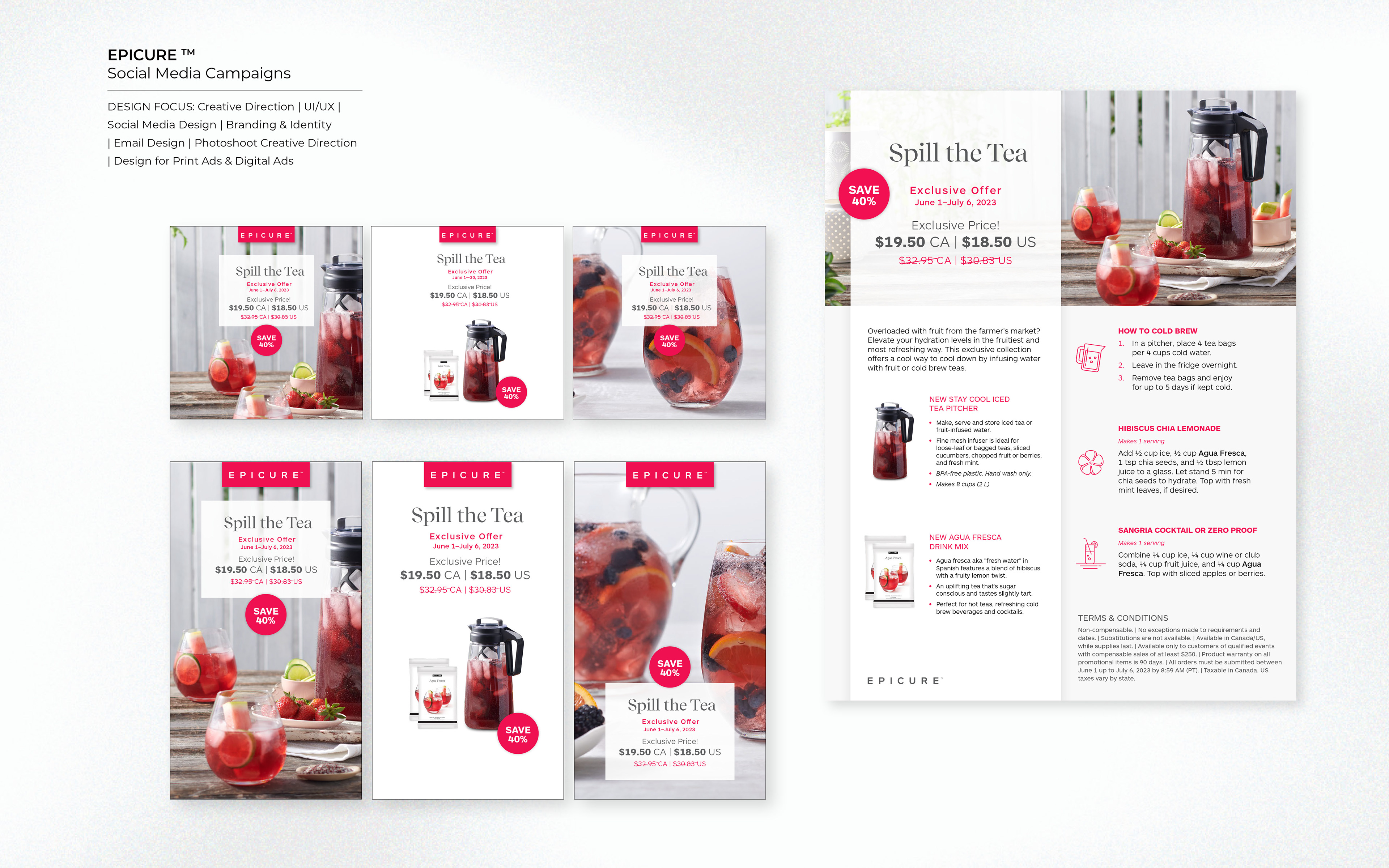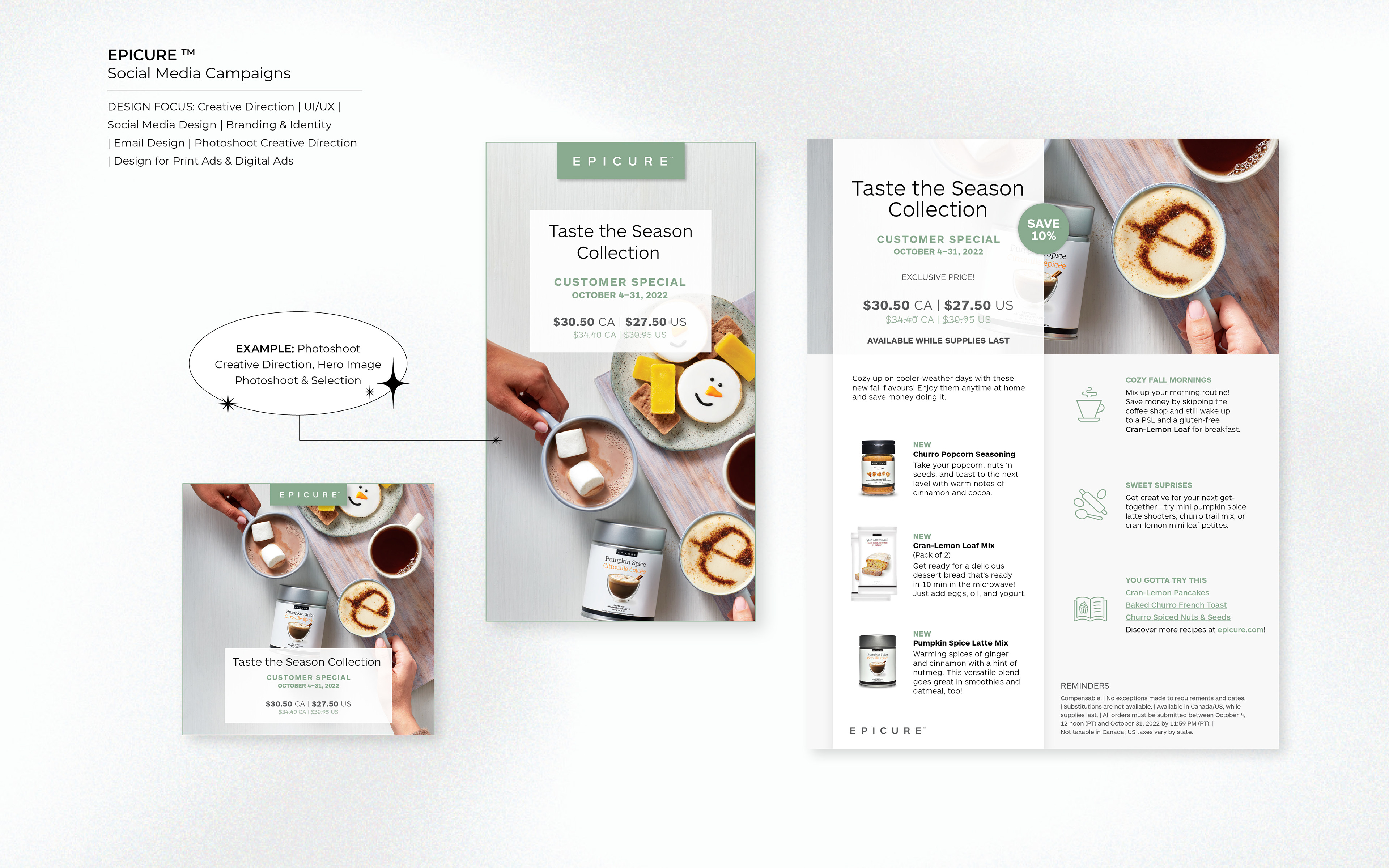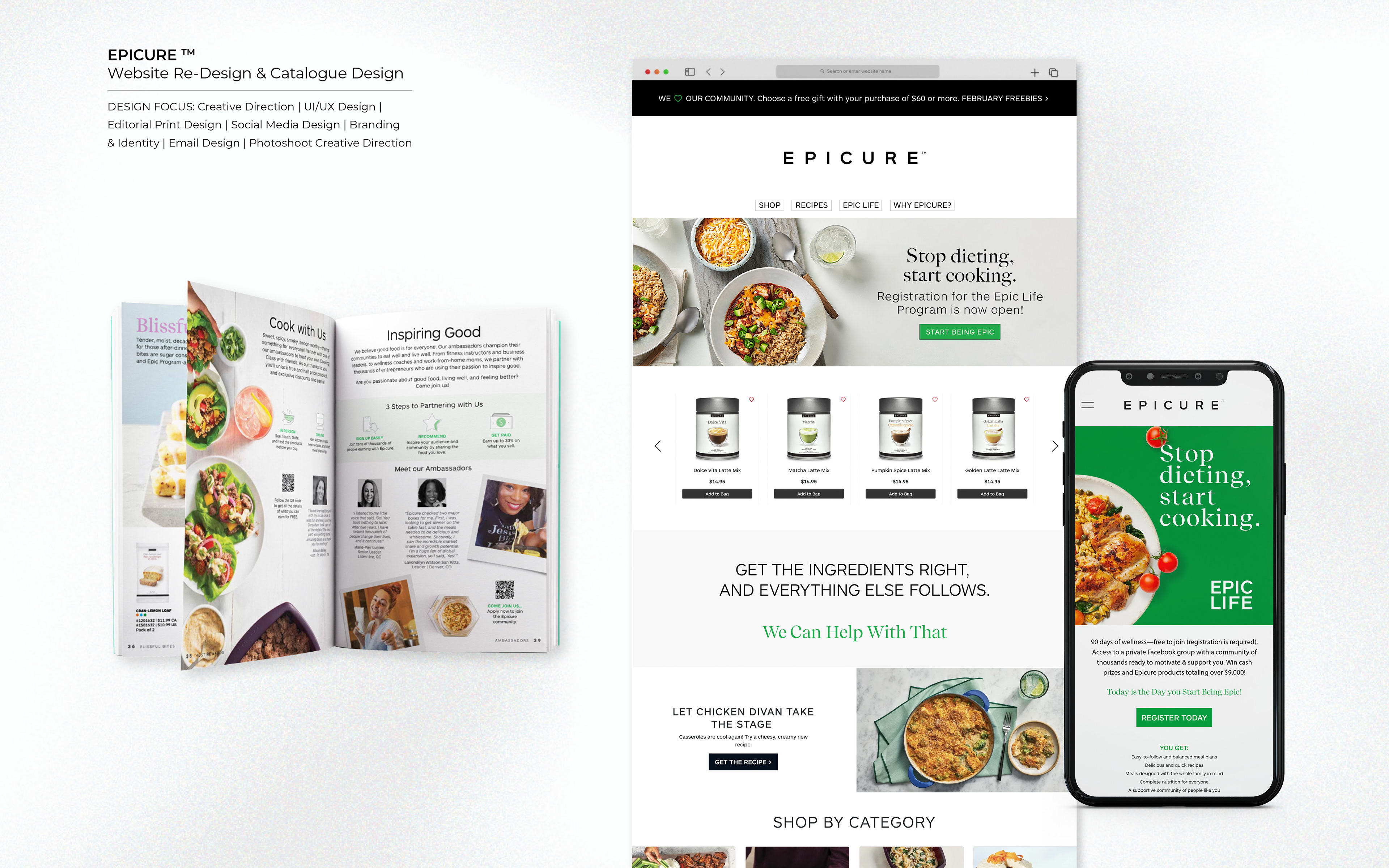 During my time with Epicure I led all month re-occuring promotions, as well as led the concepting and design for the new campaigns and temporary products. I designed Packaging Design for the Epic Box, the Protein Powder, as well as seasonal Holiday Packaging. Taking on the company's web re-design, and social strategy, I also assisted with the Monthly Catalogue design. Creative Direction of online-photo shoots for product shots as well as selection of Hero Images.