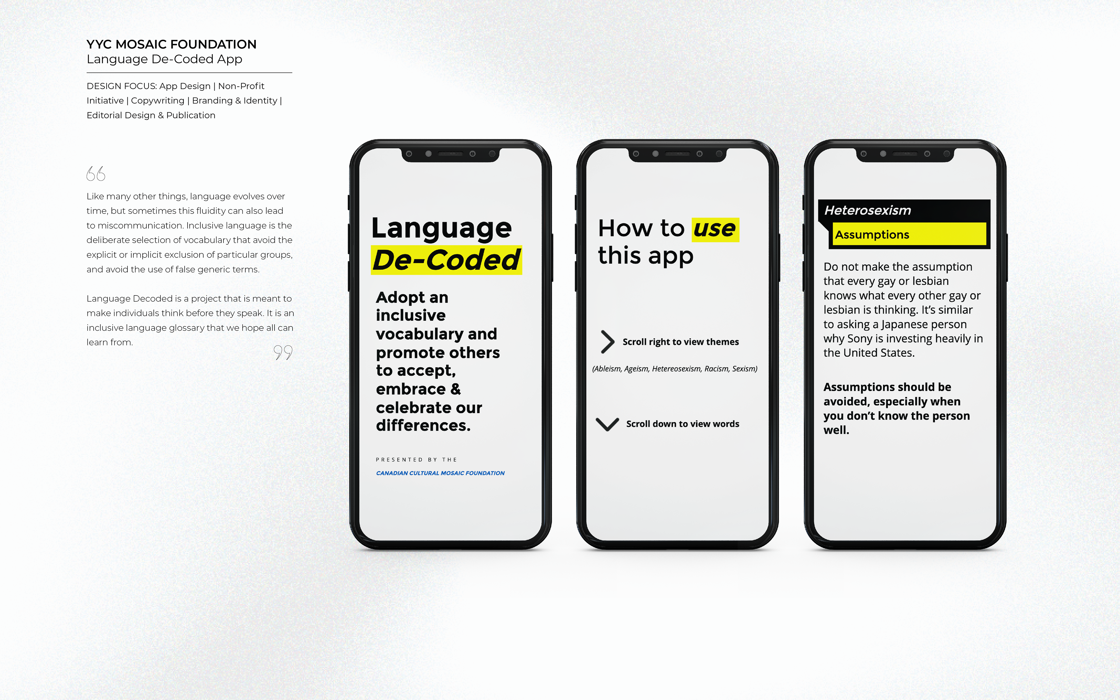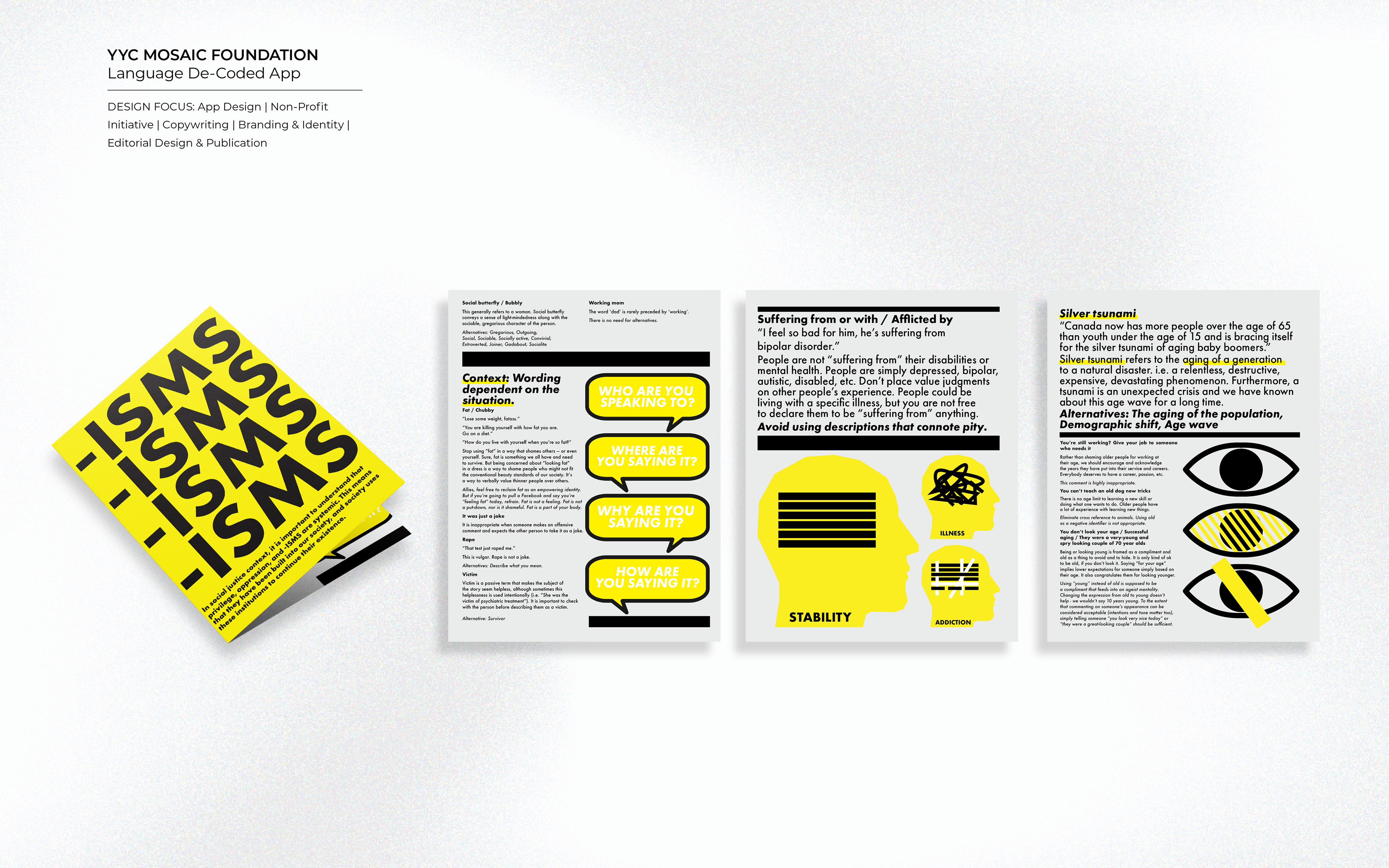 (2018) CUSTOM APP DESIGN – portray the importance of language and how we use it on a day to day. EDITORIAL DESIGN – of accompanying glossary 'zine' for print. CREATIVE DIRECTION of another designer on the team for the general look and feel of the project. RATIONALE – the design objective was to have graphics and themes that were as 'abrasive' as the language used by many today, the goal was to disrupt, inform, and re-direct others into using an all-inclusive language in our day to day.