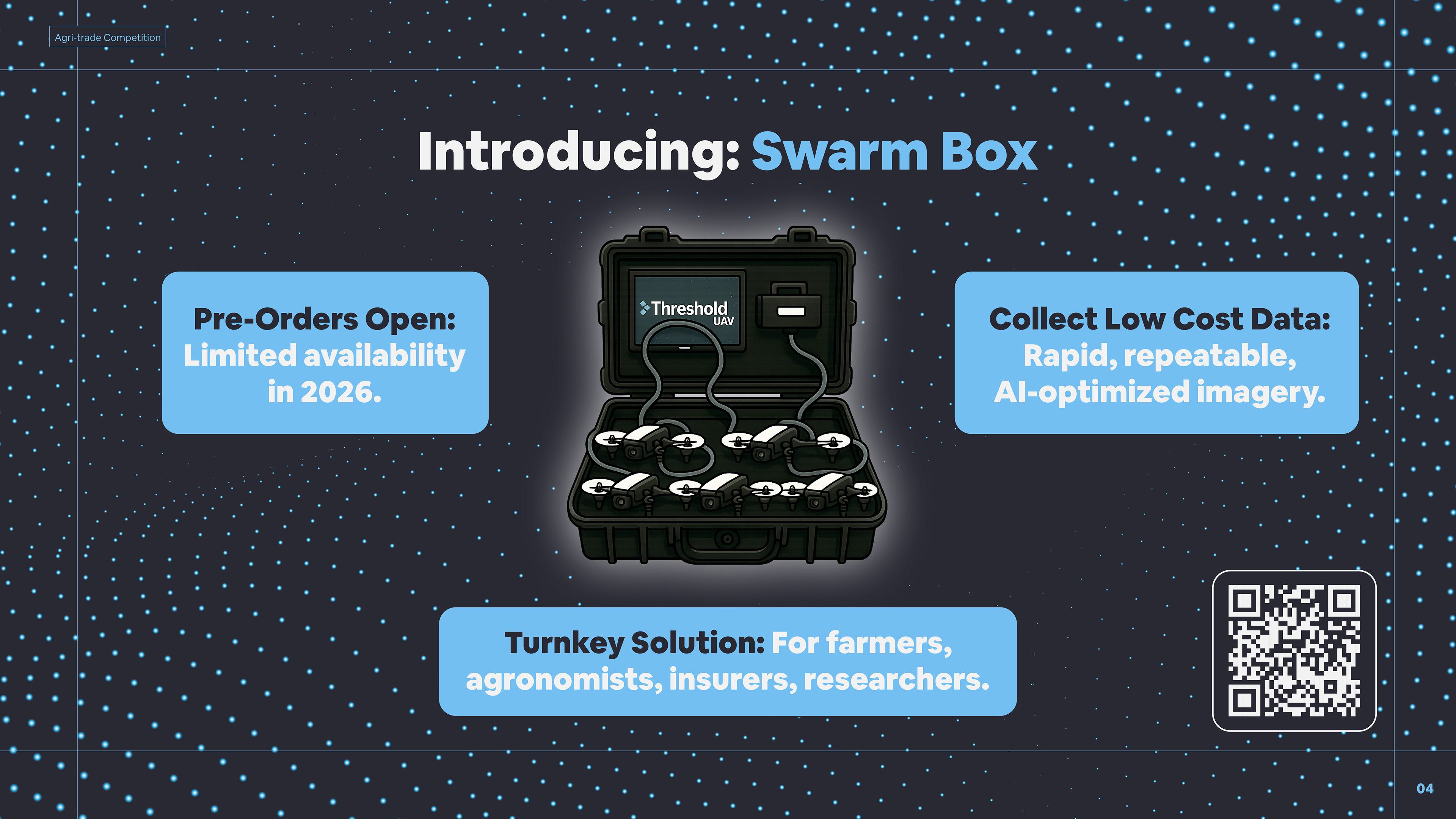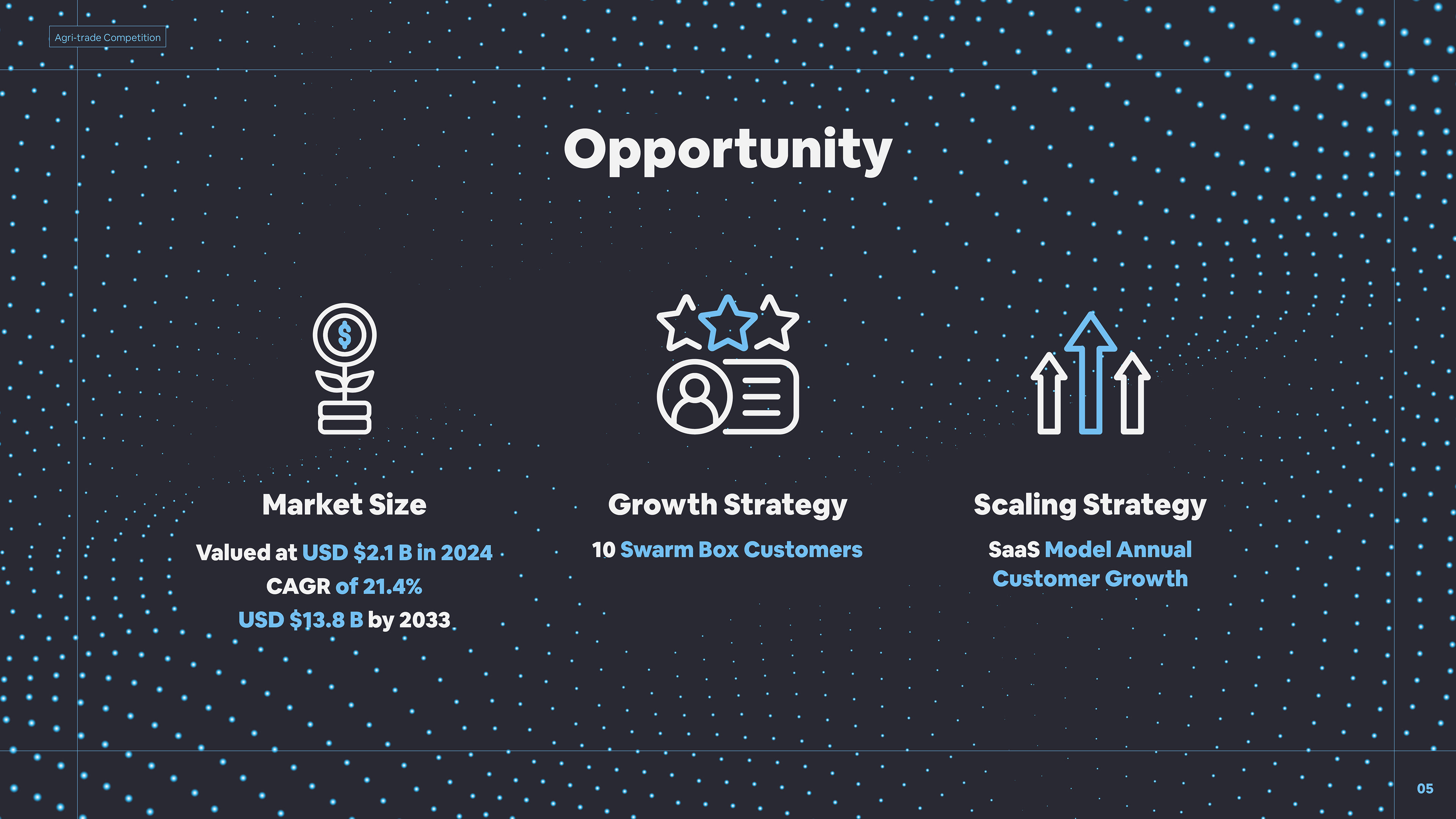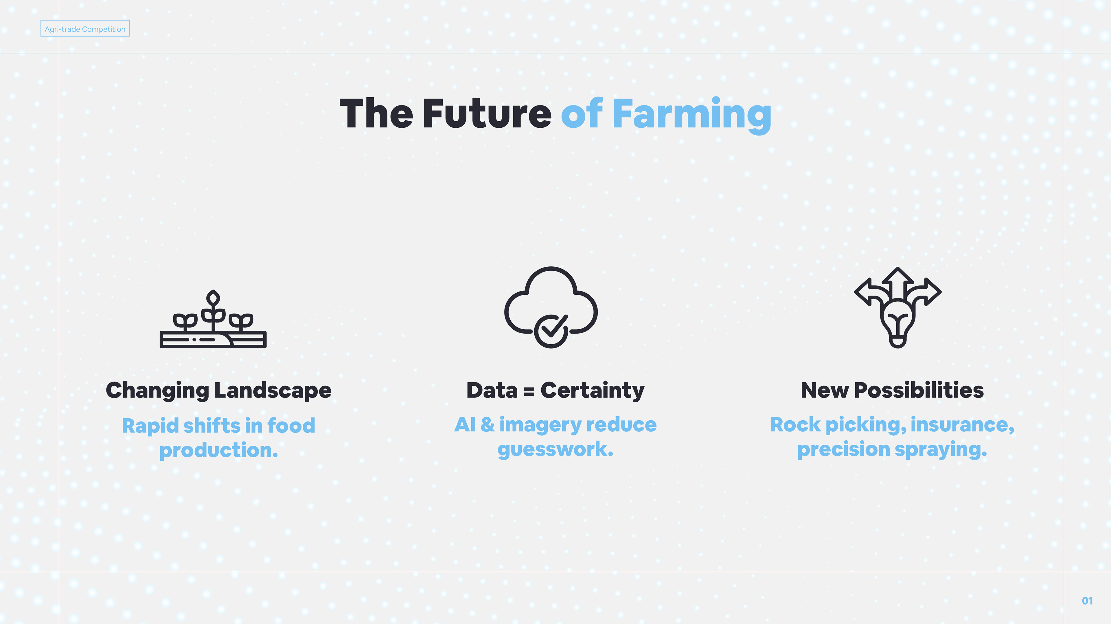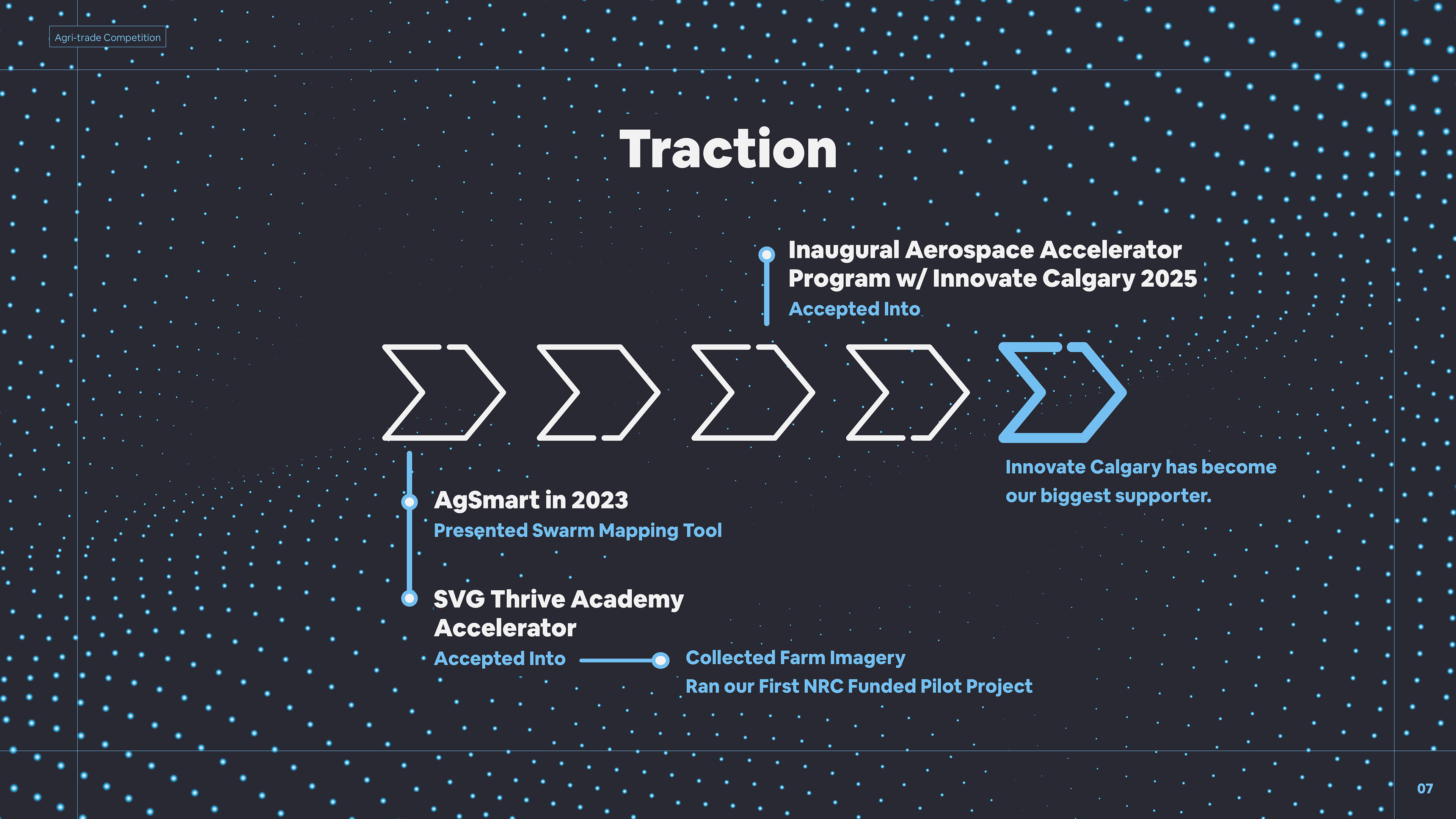 One of several Pitch Decks designed for presentation to Investors, and peers within Agriculture, Tech and Industrial industries. This deck helped the team win the competition, taking home a $20,000 cheque.